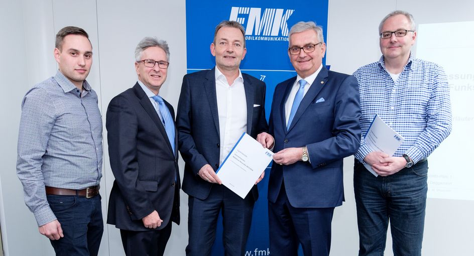Übergabe des Ergebnisberichts an den Österreichischen Gemeindebund (v.l.n.r: Florian Grassl, Dr. Walter Leiss, FMK-Präsident Marcus Grausam, Gemeindebund-Präsident Alfred Riedl, Prof. Matthias Wuschek)
