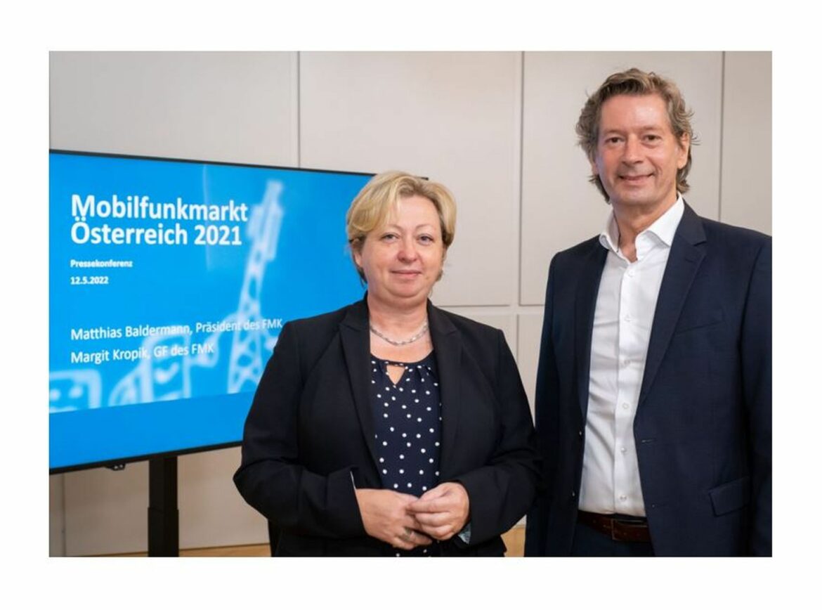 Matthias Baldermann, Präsident des FMK und CTO von Hutchison Drei Austria GmbH und Margit Kropik, Geschäftsführerin des FMK berichteten über das vergangene Jahr 2021 und über aktuelle Themen in der Mobilfunkindustrie.