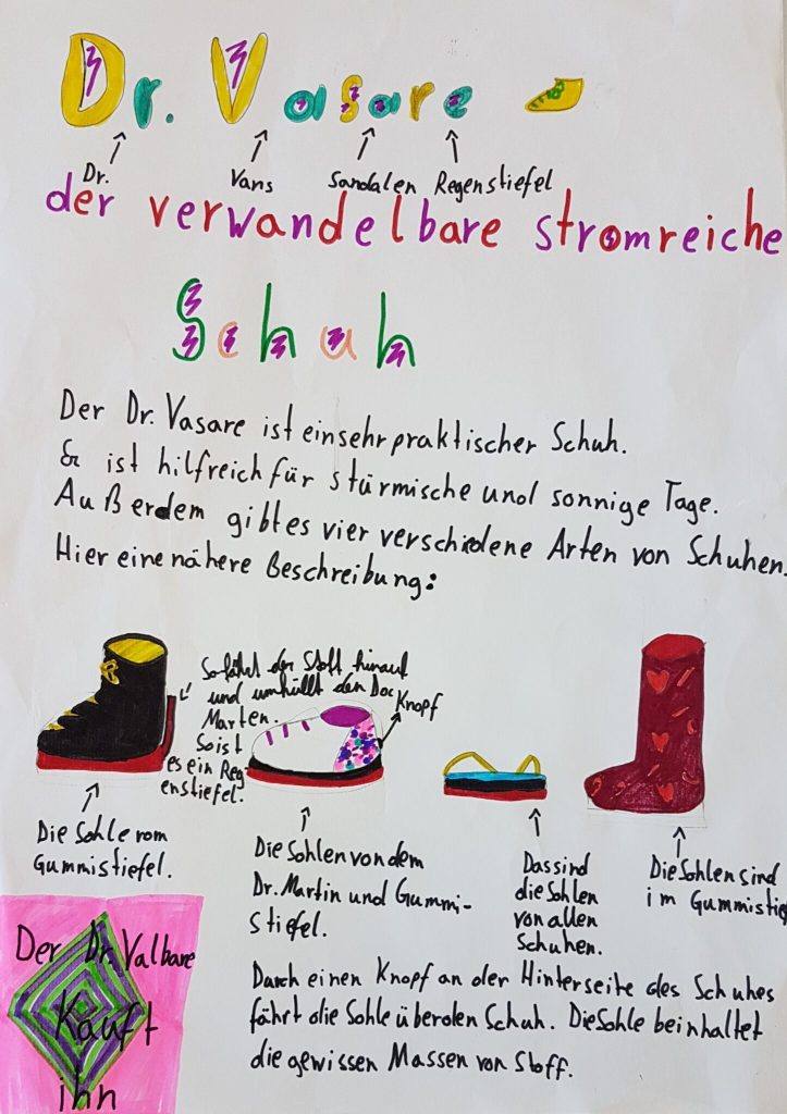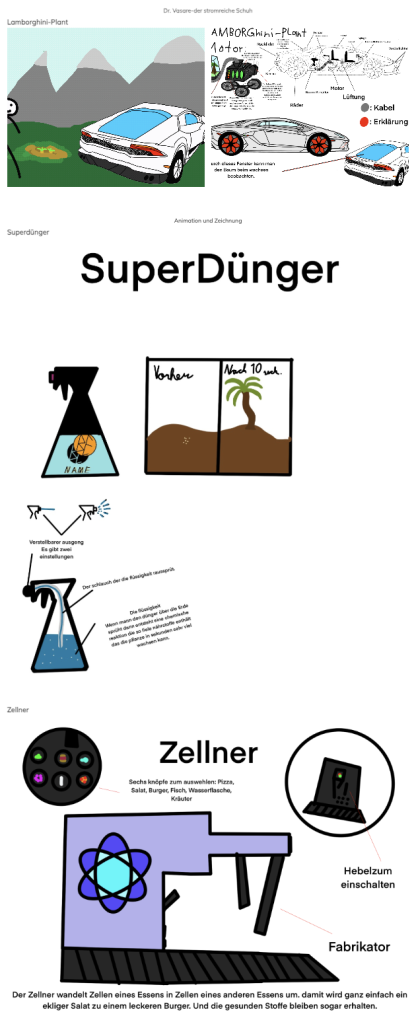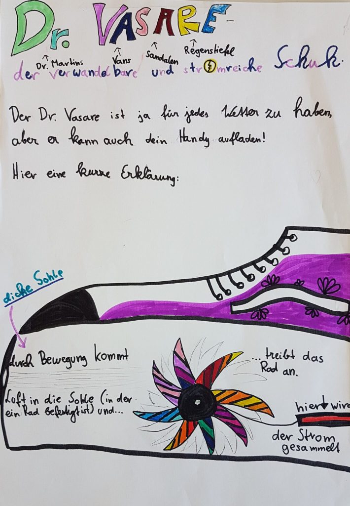 Die SchülerInnen der 1B des Akademischen Gymnasiums Innsbruck lieferten in ihren Arbeiten konkrete Entwicklungen: Etwa ein stromproduzierender Schuh, der die Bewegungsenergie beim Gehen in Strom umwandelt, mit dem auch Handys geladen werden können. Oder das Flugzeug, das Passagiere mit mehrfacher Schallgeschwindigkeit transportiert und der so genannte „Zellner“ – eine Maschine, die aus ungesunden Speisen durch Zellumwandlung gesundes Fast-Food produziert. Und ein Auto, das vegan angetrieben wird